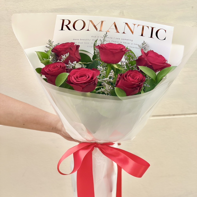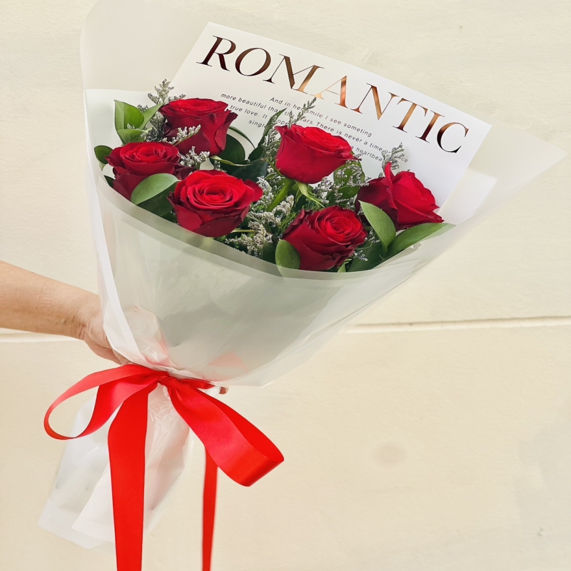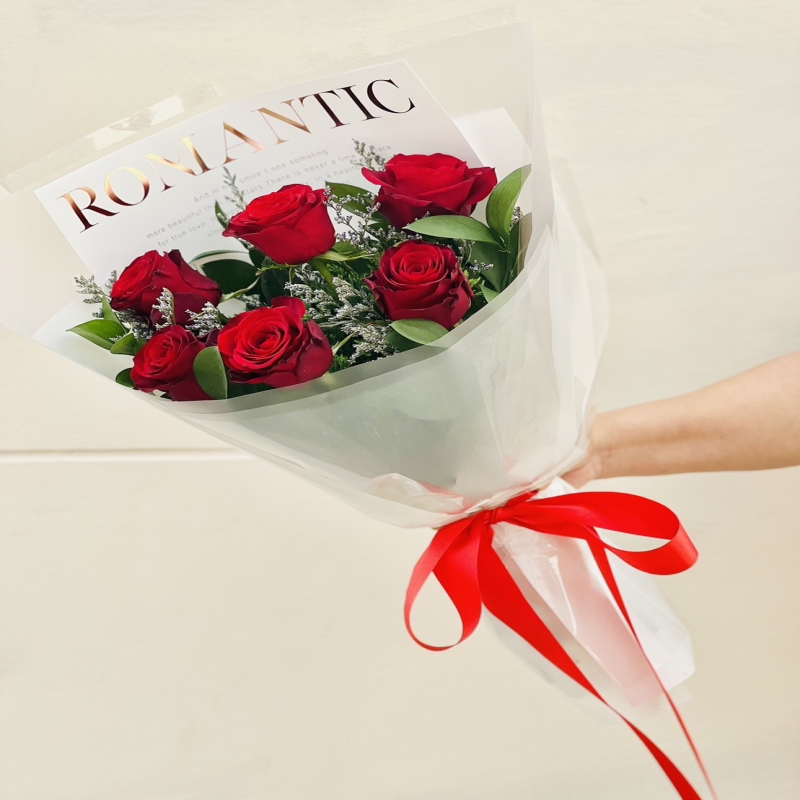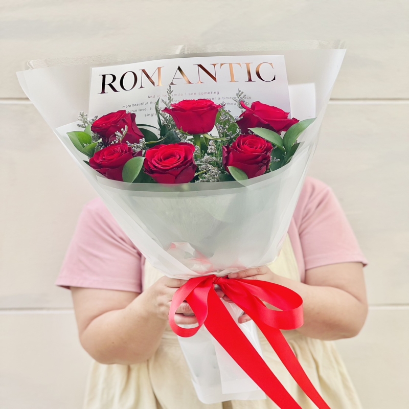 Prepare for valentines day with precious bouquet. A fresh 6 red roses are arranged in hand tie style. Start a good day with delightful and glamorous flowers. Lets flower speak for you.